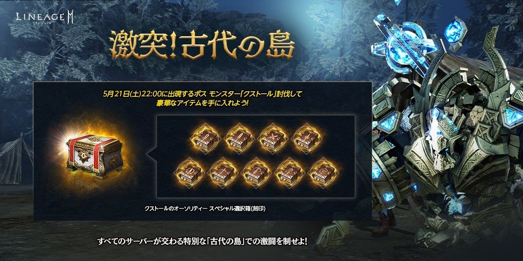 5月21日(土) 22時から、アリーナ ダンジョン「古代の島」に出現するボス モンスター「クストール」を討伐時、「クストールのオーソリティー スペシャル選択箱(刻印)」を必ずドロップします。