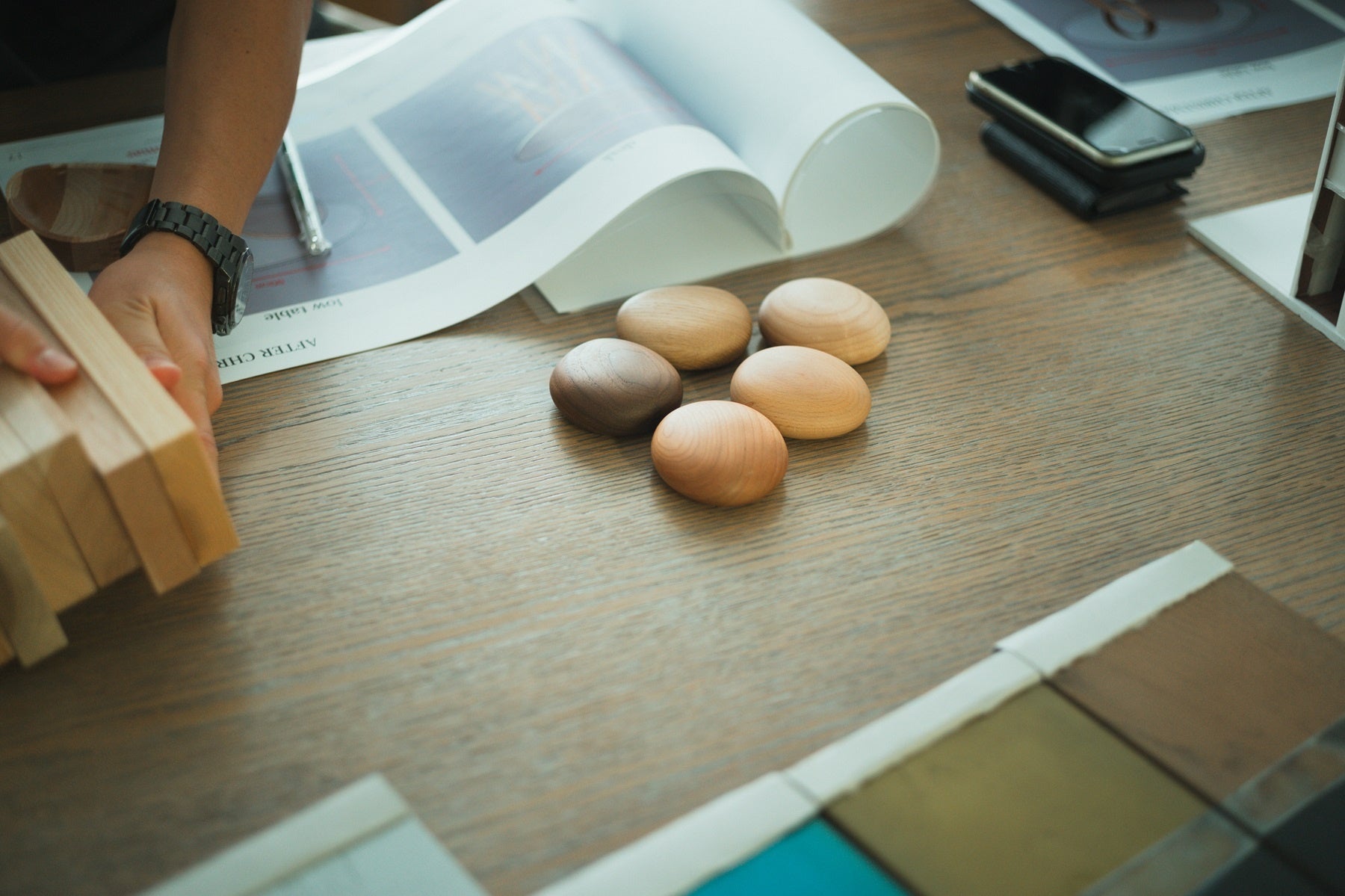 シルバーとブロンズカラーのメタリック塗装は、素材の魅⼒を最⼤限に引き出すことが重視されており、それぞれの樹種が持つ⽊⽬の美しさを⽣かすよう⼯夫されています。