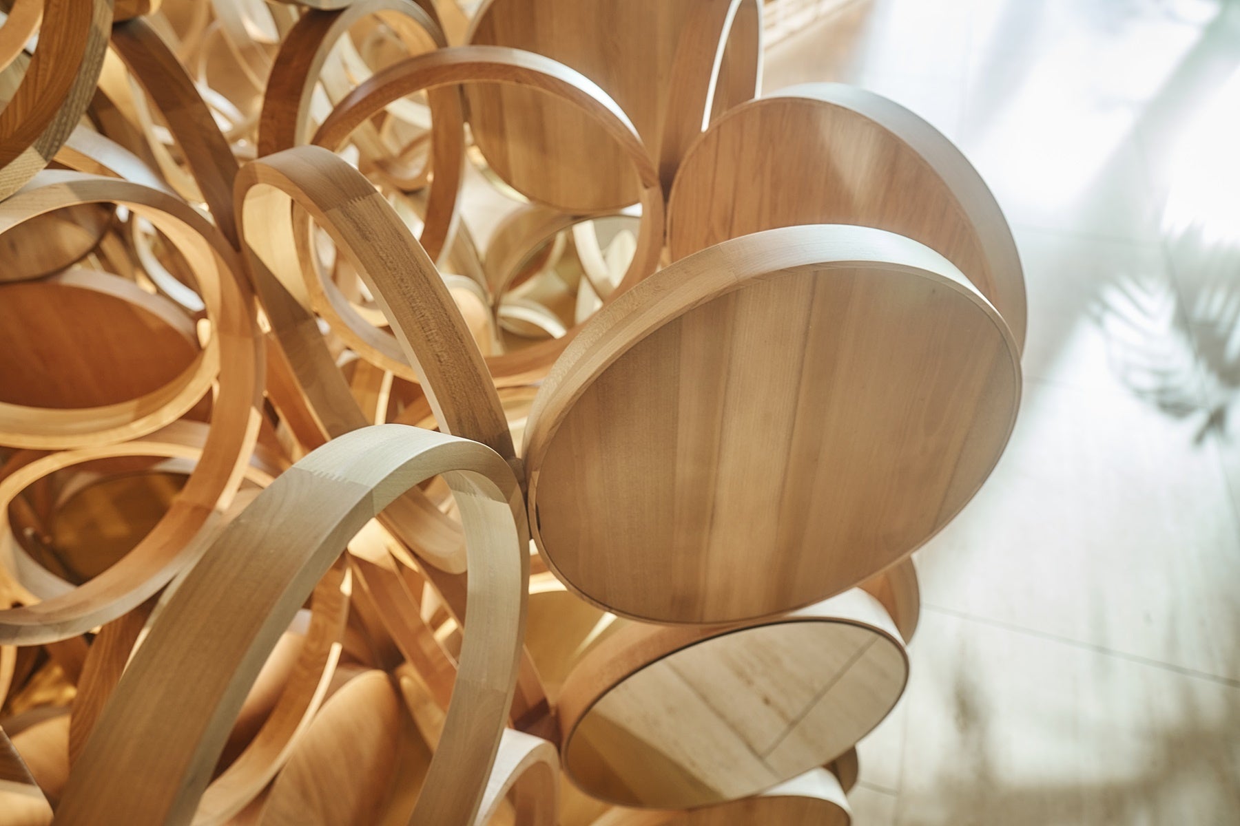 開発が進み、日々変化する若々しい街、虎ノ門。明るい『森』をイメージした高い天井のロビー空間に、『木漏れ日』が集まったようなツリーが生まれました。切削ロスを最小限に抑えるべく、小径木や曲がりのある木材といった、低利用・未利用材となってしまいがちな木材を活用して円形のパーツが作られています。