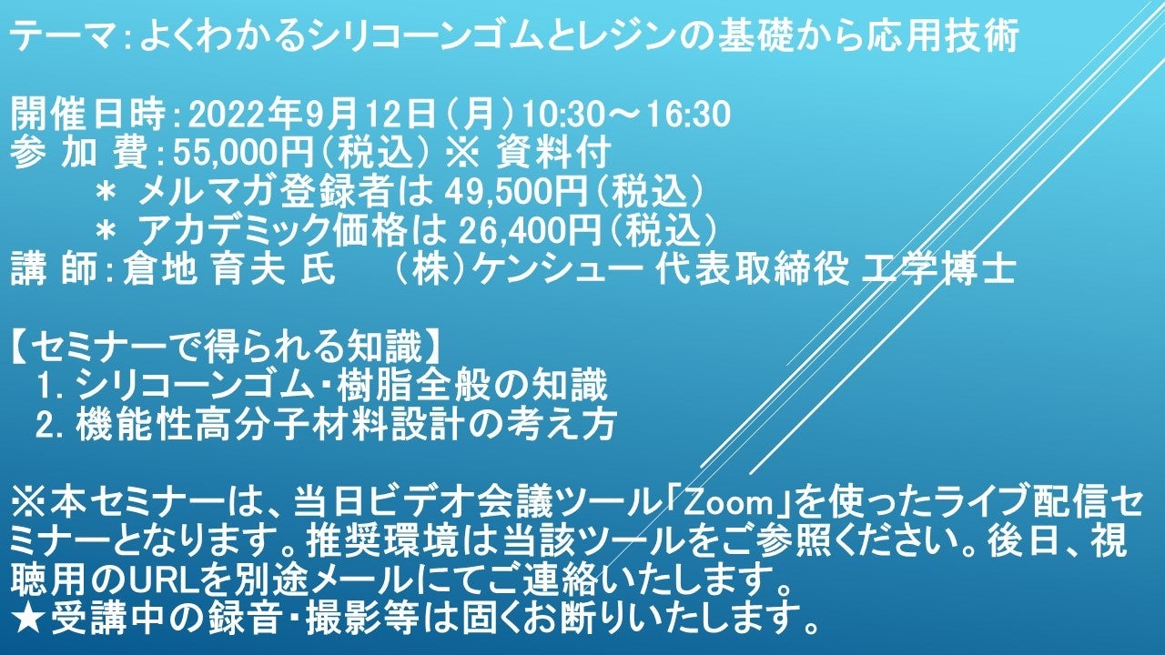 先端技術情報や市場情報を提供している(株)シーエムシー・リサーチ(千代田区神田錦町: https://cmcre.com/ )では、 各種材料・化学品などの市場動向・技術動向のセミナーや書籍発行を行っておりますが、 このたび「よくわかるシリコーンゴムとレジンの基礎から応用技術」と題するセミナーを、 講師に倉地 育夫 氏 (株)ケンシュー 代表取締役 工学博士)をお迎えし、2022年9月12日(月)10:30より、 ZOOMを利用したライブ配信で開催いたします。 受講料は、 一般:55,000円(税込)、 弊社メルマガ会員:49,500円(税込)、 アカデミック価格は26,400円(税込)となっております(資料付)。