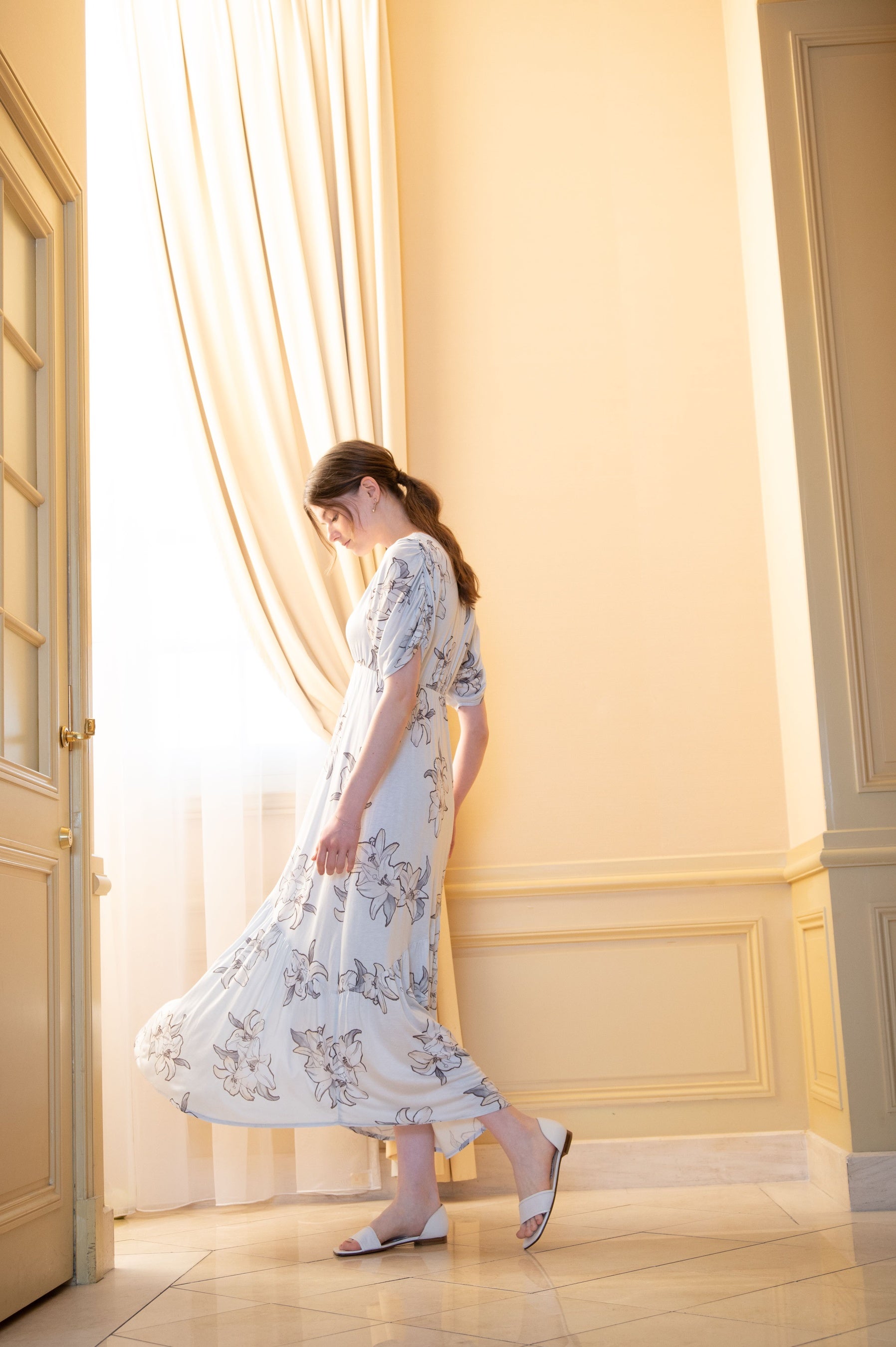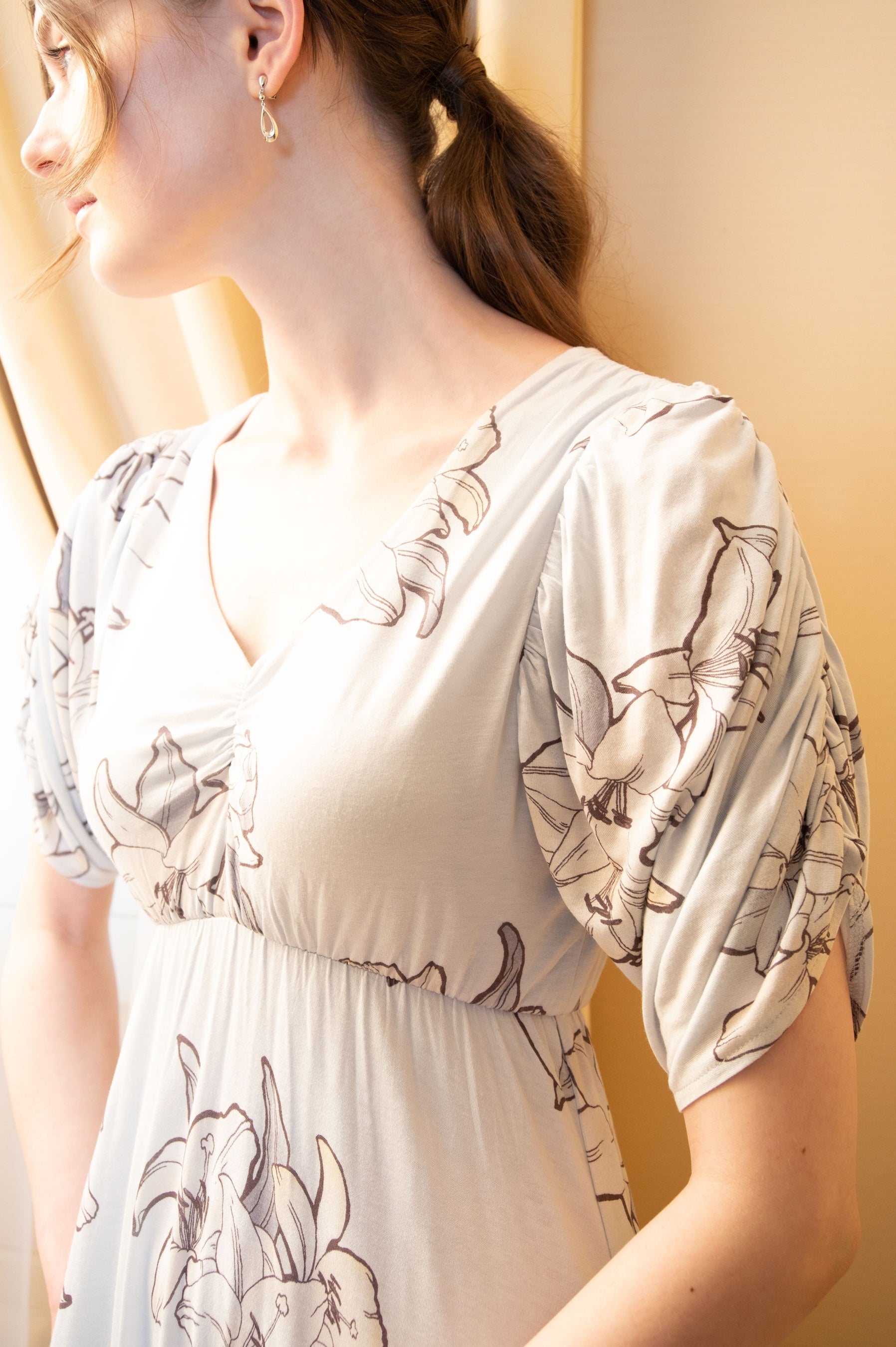サラ・ベルナールの女性像に合わせて、ギャザーを施した華やかなパフスリーブが特徴です。