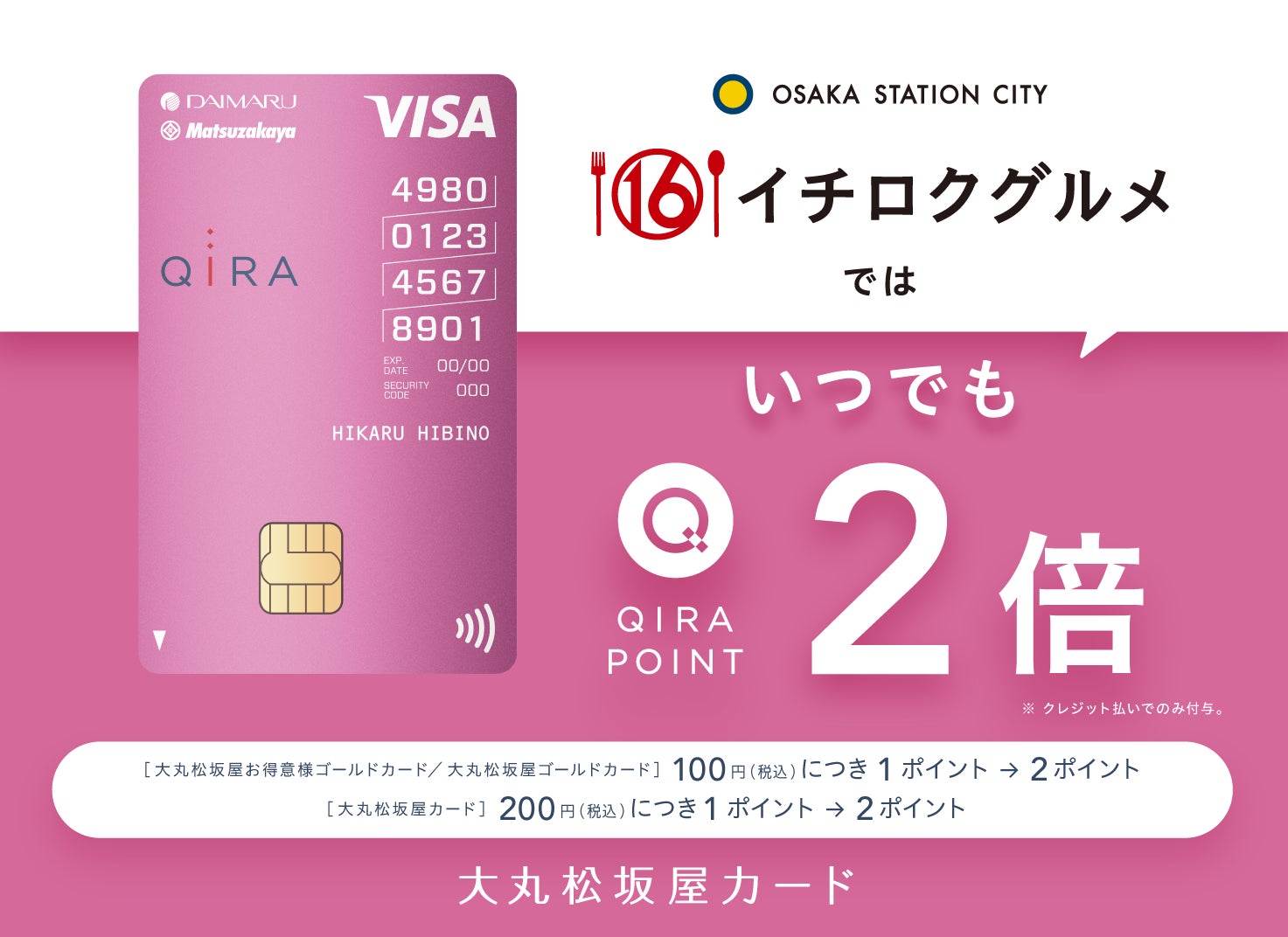 この度の契約により、本年8月1日以降、大阪ステーションシティのサウスゲートビルディング16階にある飲食フロア「イチロクグルメ」の14店舗およびその他7店舗(サウスゲートビルディング内4店舗、ノースゲートビルディング内2店舗、JR大阪駅構内1店舗)の計21店舗が加盟店となり、当該店舗でのお支払いに大丸松坂屋カードをご利用いただくと、いつでも通常の2倍の「QIRAポイント」(*1)が付与されます。