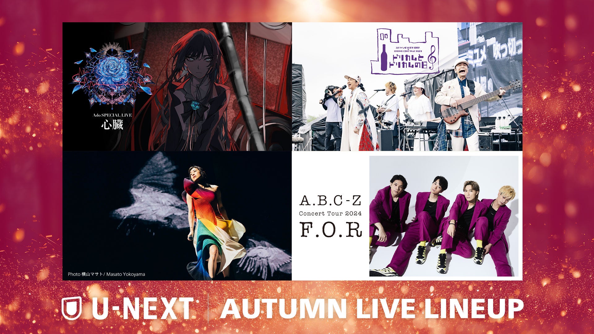 【U-NEXT】2024年秋の音楽ライブ配信ラインナップを一挙公開!Ado、DREAMS COME TRUE、宇多田ヒカル、A.B.C-Zなど珠玉のアーティストがU-NEXTに勢ぞろい!