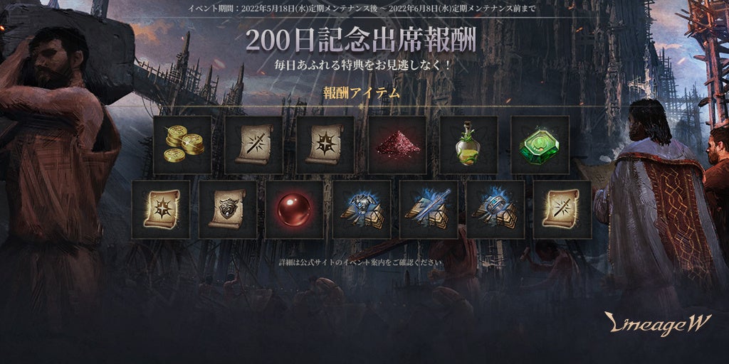 「リネージュW」サービス開始200日を記念し、期間中デイリー出席報酬と14日間の日別出席報酬を獲得できます。