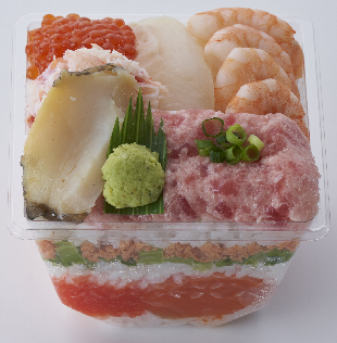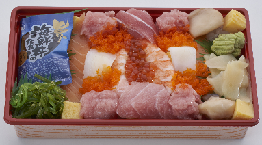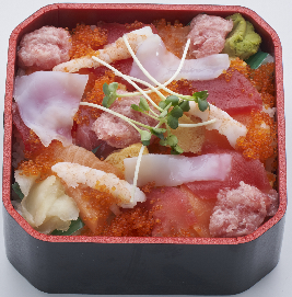 まぐろ、いか、サーモン、いくら、ししゃもっこ、ネギトロなど10種類のネタを使った具沢山ちらし。