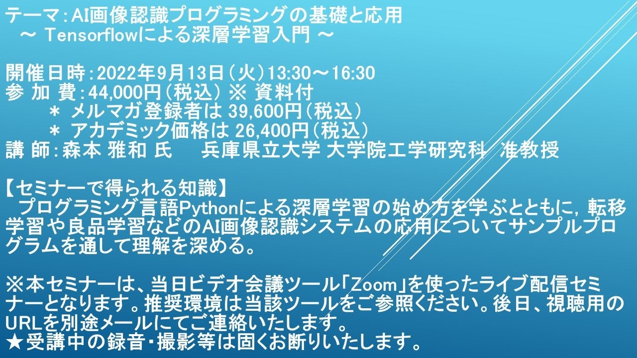 先端技術情報や市場情報を提供している(株)シーエムシー・リサーチ(千代田区神田錦町: https://cmcre.com/ )では、 各種材料・化学品などの市場動向・技術動向のセミナーや書籍発行を行っておりますが、 このたび「AI画像認識プログラミングの基礎と応用 ~ Tensorflowによる深層学習入門 ~」と題するセミナーを、 講師に森本 雅和 氏 兵庫県立大学 大学院工学研究科 准教授)をお迎えし、2022年9月13日(火)13:30より、 ZOOMを利用したライブ配信で開催いたします。 受講料は、 一般:44,000円(税込)、 弊社メルマガ会員:39,600円(税込)、 アカデミック価格は26,400円(税込)となっております(資料付)。