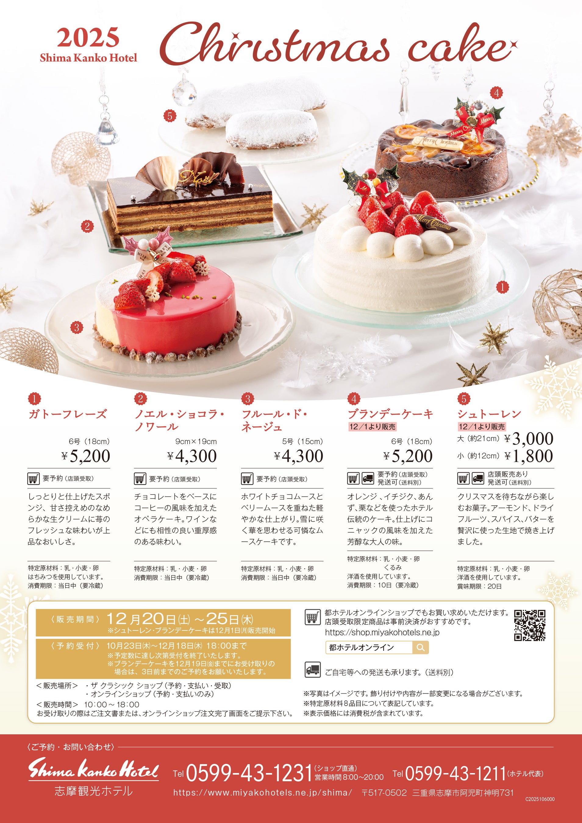 志摩観光ホテル(所在地:三重県志摩市阿児町神明731)は、定番から新作まで多彩に揃えた2025年クリスマスケーキ全5種のご予約受付を2025年10月23日(木)より開始します。