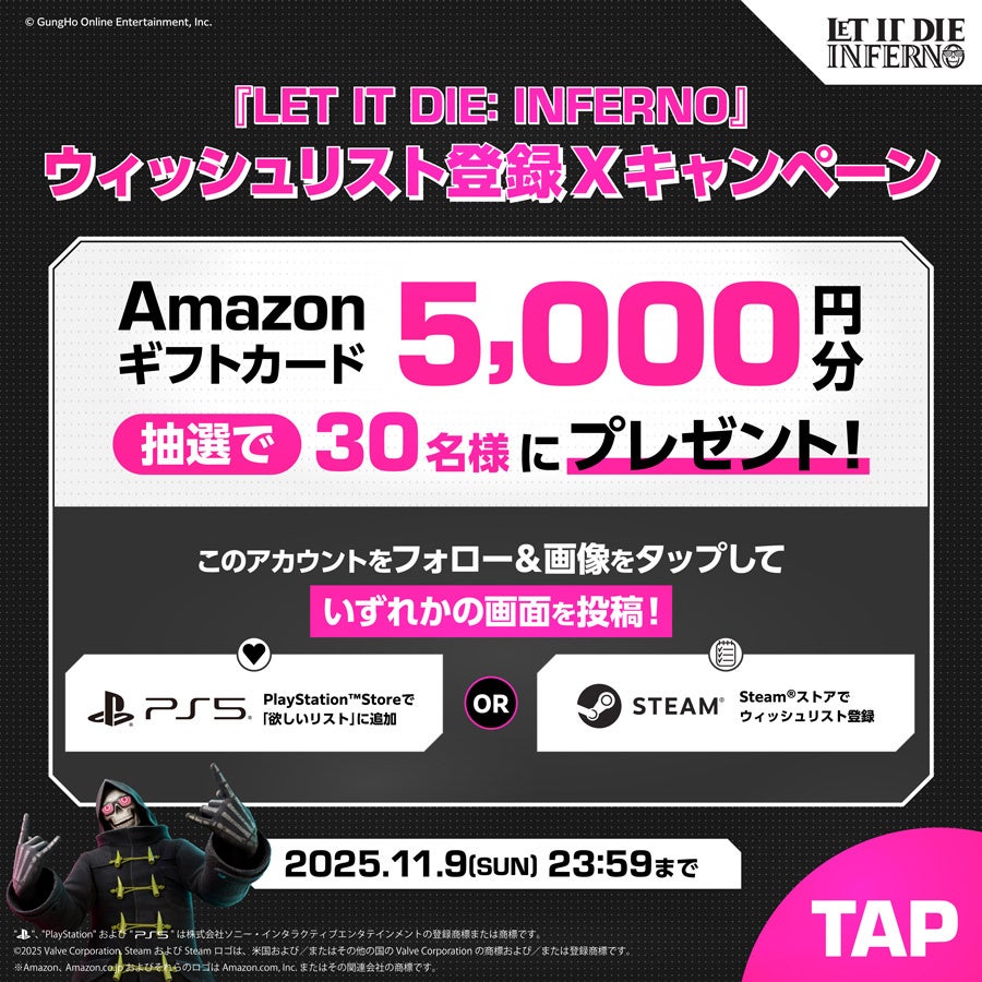 【LET IT DIE: INFERNO】Amazonギフトカード5,000円分が当たる!「ウィッシュリスト登録Xキャンペーン」開始!