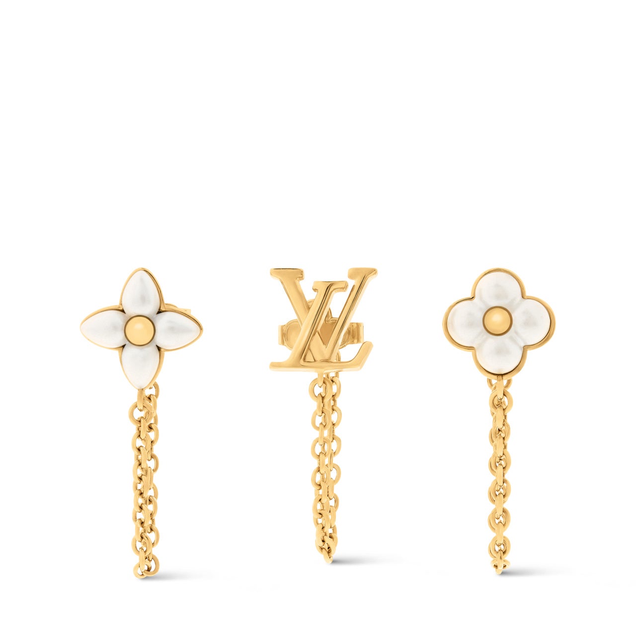 メゾン定番の3つのアイコンを優雅でフェミニンなエレガンスにより再解釈した「ピアス·LV フローラグラム セット3」。ゴールドカラーのリンクが付いたチェーンのディテールが、LV イニシャルと2つの異なるモノグラム·フラワーを象った精緻なピアスにアクセントを添えます。単体や重ね着けでパーソナライズされた独創的な装いを楽しめる、シックで万能なアイテム。