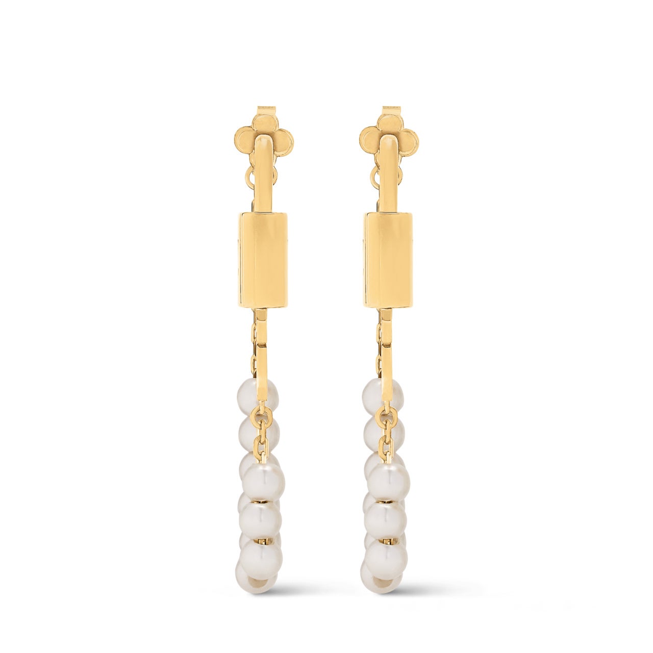 ルイ·ヴィトンの定番アイコンとレジンパールの繊細なきらめきを組み合わせた「ピアス·パーロック」。ホワイトレジンパールのループとチャンキーなゴールドカラーのチェーンに鍵でつながれた、メゾンを象徴するLV ロゴ入りのパドロック(錠前)をセンターピースとしてあしらいました。エレガントでトレンディな装いにもふさわしい、多彩なコーディネートに活躍するピアスです。