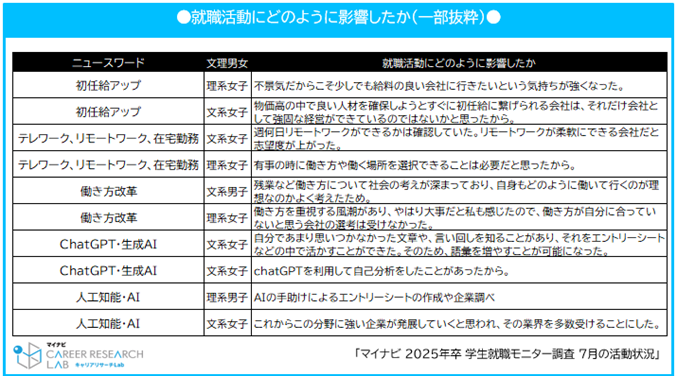 ニュースワードが就職活動にどのように影響したかを自由回答で聞いたところ「(初任給アップ)不景気だからこそ少しでも給料の良い会社に行きたいという気持ちが強くなった」「(テレワーク、リモートワーク、在宅勤務)リモートワークが柔軟にできる会社だと志望度が上がった」などの回答が見られ、社会情勢や柔軟な働き方が企業選びに影響していることがわかる。また「(ChatGPT・対話型AI)ChatGPTを利用して自己分析をしたことがあったから」「(人工知能・AI)AIの手助けによるエントリーシートの作成や企業調べ」といった回答もあり、AIを活用して効率的に就職活動を進めている様子がうかがえる。【図4、5】