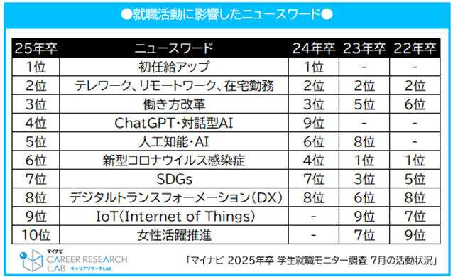 就職活動に影響したニュースワードについて60個の選択肢の中から選んでもらったところ、前年に引き続き、最も多く選ばれたのは「初任給アップ(27.6%)」だった。2位は4年連続で「テレワーク、リモートワーク、在宅勤務(19.3%)」、3位は2年連続で「働き方改革(18.4%)」となった。