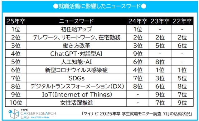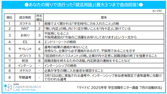 新たにTOP10に入ったのは8位(同率)の「インターン」「オヤカク」「早期選考」となった。三省合意によって25年卒から「インターンシップ」の定義が改正されたことや、内定辞退対策を目的とした企業の「オヤカク」(親への確認)の動きが増えたことから報道も多く、学生の中でも話題になったと推察される。また、「早期選考」と回答する学生も目立ち、企業の選考活動が前倒しになっていることも注目されているようだ。【図3】