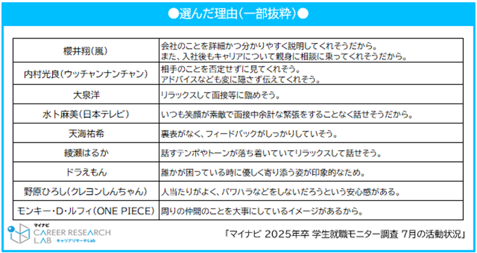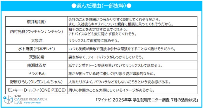 就活生にとっての「理想の人事担当者」像を探るため、就活生に「この人が人事担当だったら、その会社に入社したい」と思う男性有名人、女性有名人、架空のキャラクターをそれぞれ挙げてもらった。男性部門は櫻井翔さん(調査開始以来6年連続1位)、女性部門は日本テレビアナウンサーの水卜麻美さん(4年連続1位)、キャラクター部門はドラえもん(調査開始以来6年連続1位)が1位となり、例年と変わらず大きな支持を集めた。選んだ理由は「親身に相談にのってくれそう」「緊張をすることなく話せそう」といったものが多く、学生に寄り添ってくれそうな理想の人事像としてイメージされているようだ。【図1、2】