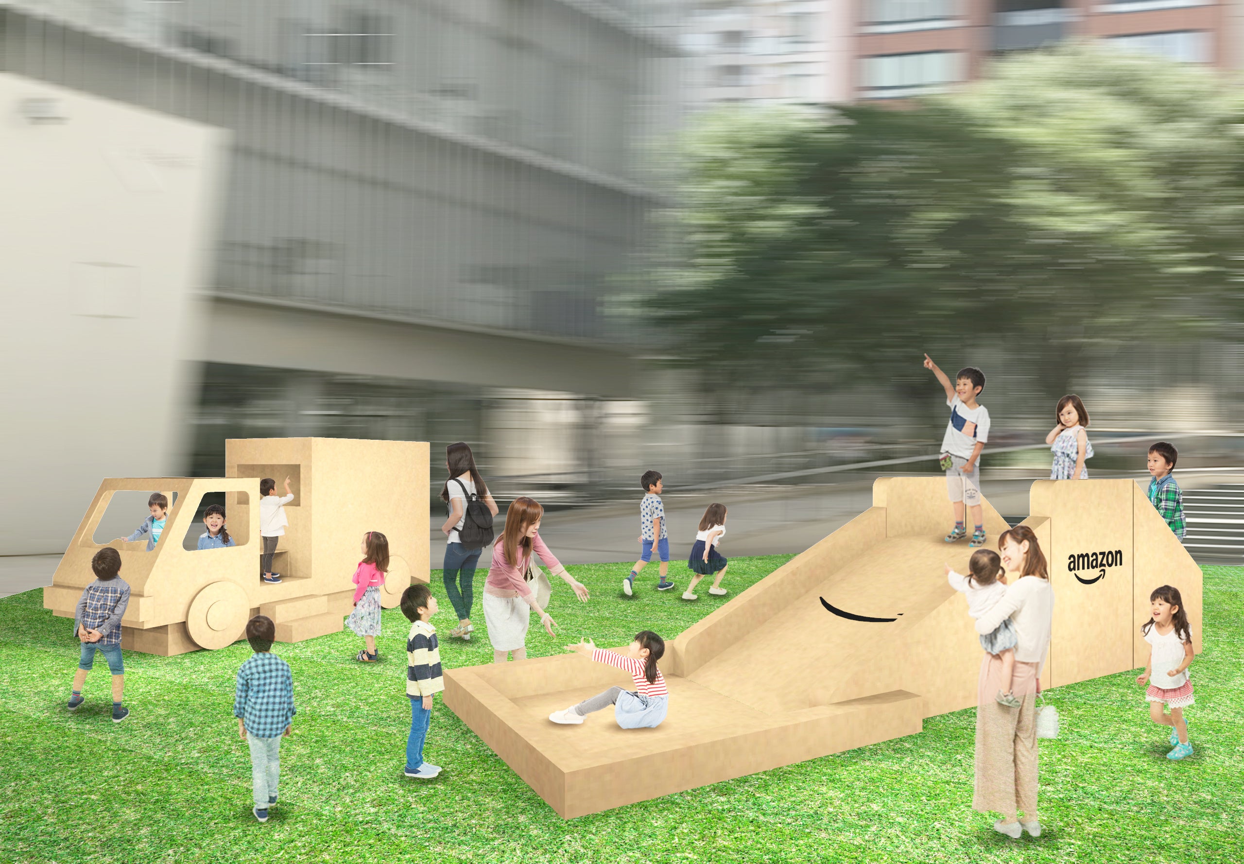 お子様とのお出かけスポットとしても最近人気のダンボール遊具を設置します。Amazonのスマイルマークの中にボールを入れて遊べる「ボールプール」、遊具には欠かせないすべり台「スライダー」などをご用意し、お子様連れのご家族の皆様に、一足早い夏の思い出づくりの機会をご提供します。