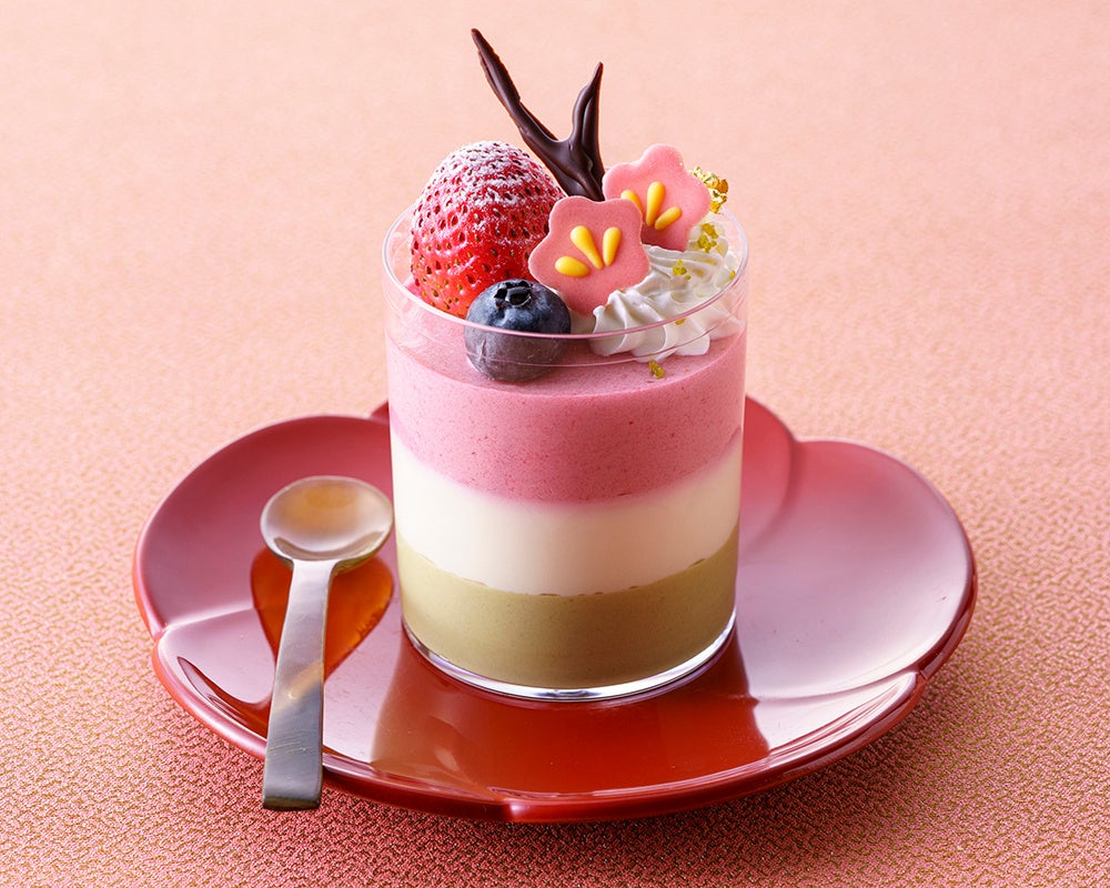 期間限定スイーツの「ひなまつり」は、ラズベリーといちごのムース・ホワイトチョコレートムース・ピスタチオのムースを重ね、菱餅をイメージさせる色で仕上げました。層の間には求肥やスポンジケーキをはさみ、食感のアクセントも楽しめるケーキです。