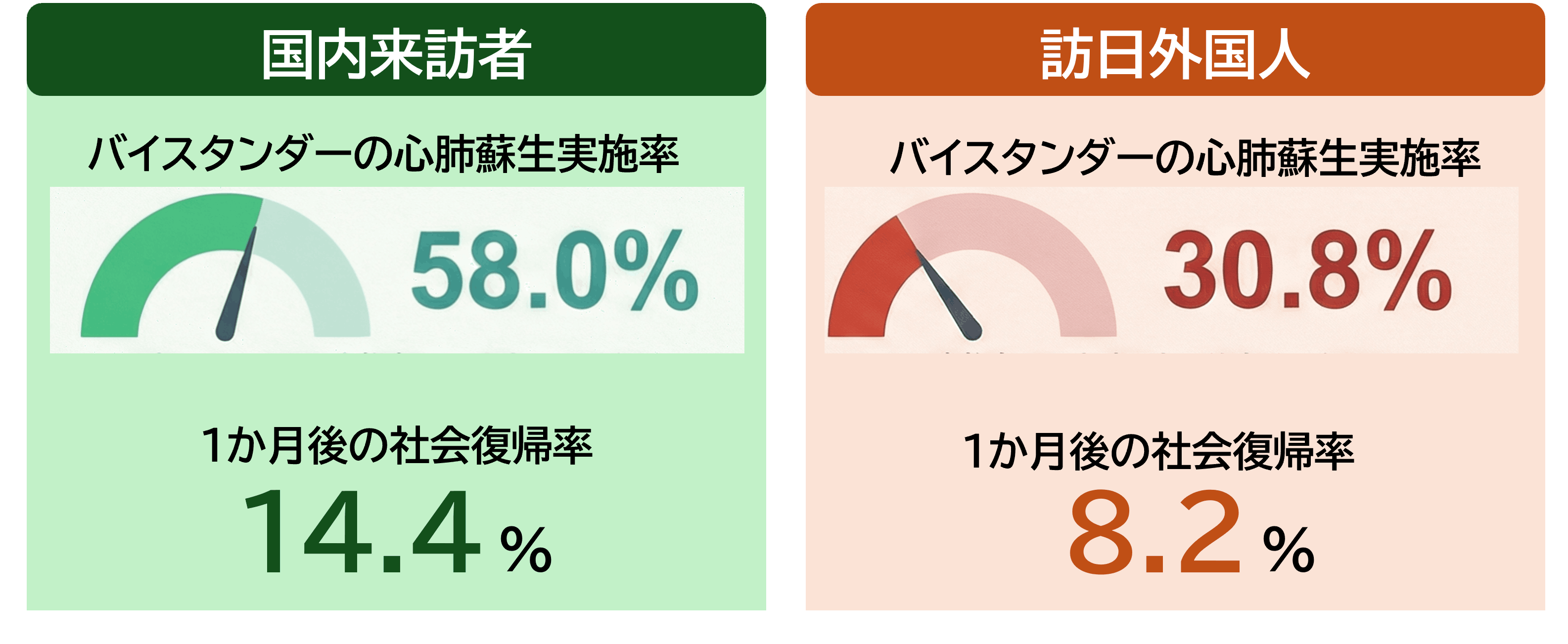 本研究により、日本における院外心停止の救命率が、来訪者の属性によって異なる可能性が示されました。特に訪日外国人では、言語や文化の違い、周囲の人との関係性の希薄さなどが、バイスタンダーによる救命処置に影響している可能性があります。