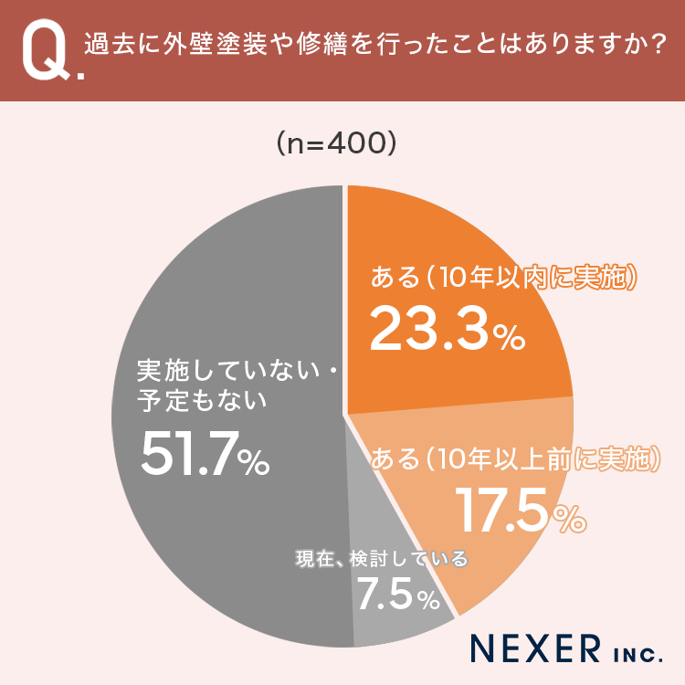 そこで今回は塗り替えショップと共同で、持ち家の一戸建てに住んでいる全国の男女400名を対象に「外壁塗装や修繕」についてのアンケートをおこないました。