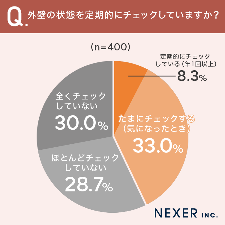 8.3%が「定期的にチェックしている(年1回以上)」、33%が「たまにチェックする(気になったとき)」と回答し、合計41.3%が外壁の状態をチェックしていることが分かりました。