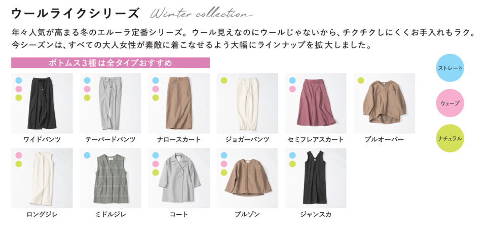Eluraで冬シーズン大人気の「ウールライクシリーズ」。大人気・定番のワイドパンツやロングジレに加え、今年はラインナップを大幅に拡充。今回初めて登場するアイテムも多数加えた全11アイテムが登場しました。ロングセラーのワイドパンツは「全骨格タイプに似合う」というお墨付きを獲得(他、テーパードパンツ・ナロースカート・コート・ブルゾンも全骨格タイプOK)。その他、今回新登場するアイテムはすべて二神氏に詳細なシルエットまで監修いただき、より各骨格タイプに似合うシルエットにするべく微調整を重ねています。