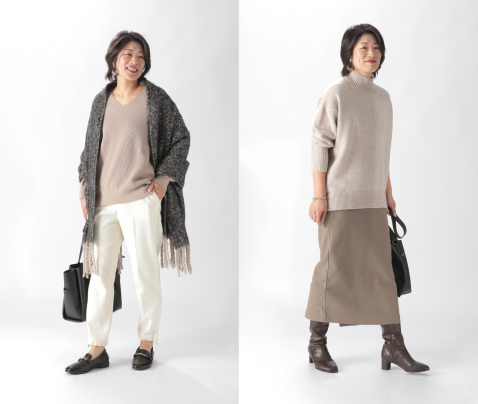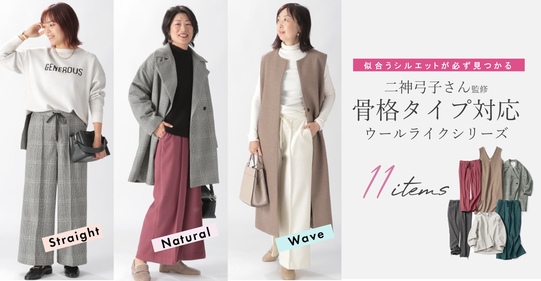 今年の秋、「何を着てもしっくりこない」「スタイルが良く見えるシルエットがわからない」等、大人女性が抱える課題を解決すべく、初めて骨格診断のスペシャリスト・二神弓子氏に監修いただき「サマ見えリラクシーシリーズ」を販売し、多くの大人女性より支持いただきました。秋に続き冬シーズンもすべての大人女性に似合うアイテムを提案するべく、骨格タイプ対応企画第2弾として「ウールライクシリーズ」全11アイテムを二神氏に監修いただきました。