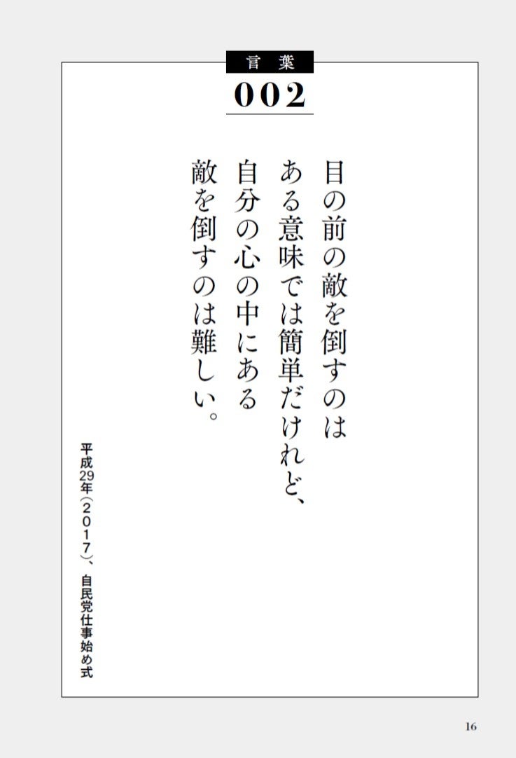 「生き方」「家族」「仕事」「外交・人間関係」「政治・政策」の5つの章にわけて解説