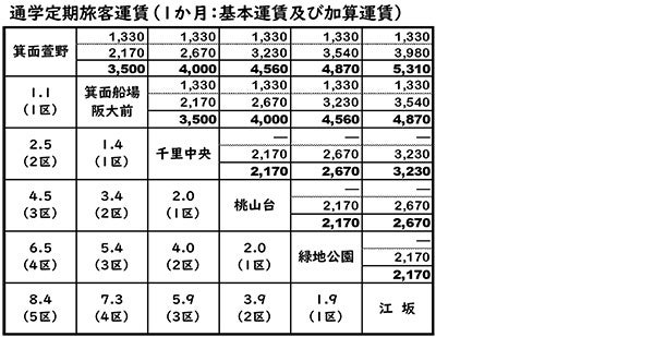 適用区間:箕面萱野駅⇔緑地公園駅間、箕面船場阪大前駅⇔江坂駅間