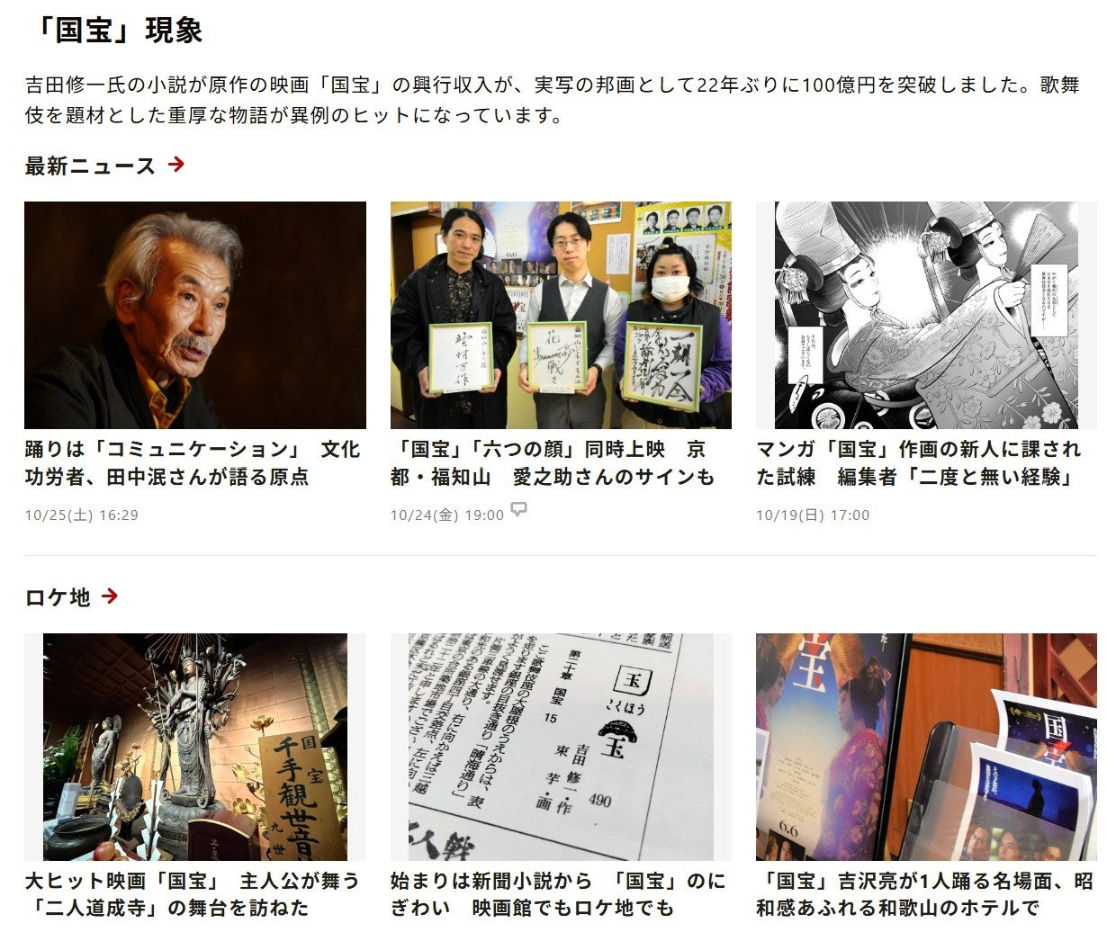 朝日新聞のデジタル版に設けた「『国宝』現象」と題したトピックスページでは、新聞紙面はもちろん、デジタル配信されたものも含め、「国宝」関連のコンテンツが一覧できます。映画で歌舞伎の女形スターを演じた吉沢亮さんのインタビューや、李相日監督と原作者の吉田修一さんの対談など、「国宝」の世界に没入いただけます。