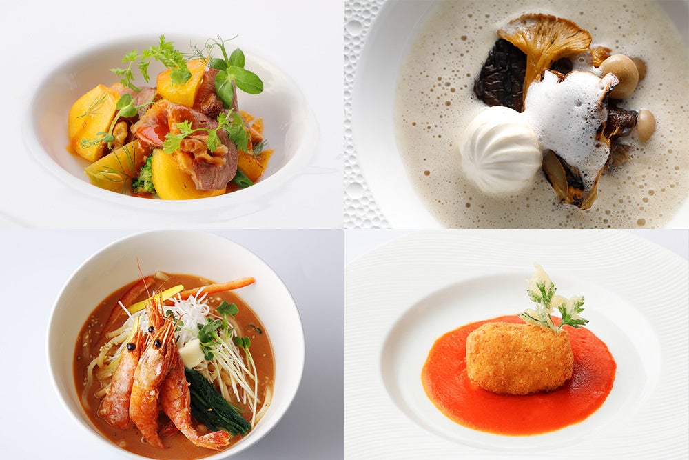 今回のフェアでは、三國シェフとニューオータニのコラボが実現します。前菜には、東京・あきる野市で作られているキッコーゴ醤油も使用した“鴨肉と柿のサラダ仕立て”(写真・左上)に、和出汁をベースに江戸甘味噌でコクをプラスした“江戸甘味噌と栗のクリームポタージュ カプチーノ仕立て” (写真・右上)。さらに、その質の高さから、幻の豚肉とも呼ばれる“東京X”を使用した“和牛と東京Xのミートクロケット” (写真・右下)など、江戸前食材を使用したこだわりの新作メニューの数々をプリフィクススタイルでご用意いたします。毎週土曜日には、ランチ・ディナーともにビュッフェの一部に三國シェフコーナーが登場!八丈島ジャージーバターがアクセントの“甘海老の江戸甘味噌バターラーメン(写真・左下)”や“和牛の焼きしゃぶ レモンとキッコーゴ醤油(ディナー限定)”などをお好きなだけお召し上がりいただけます。