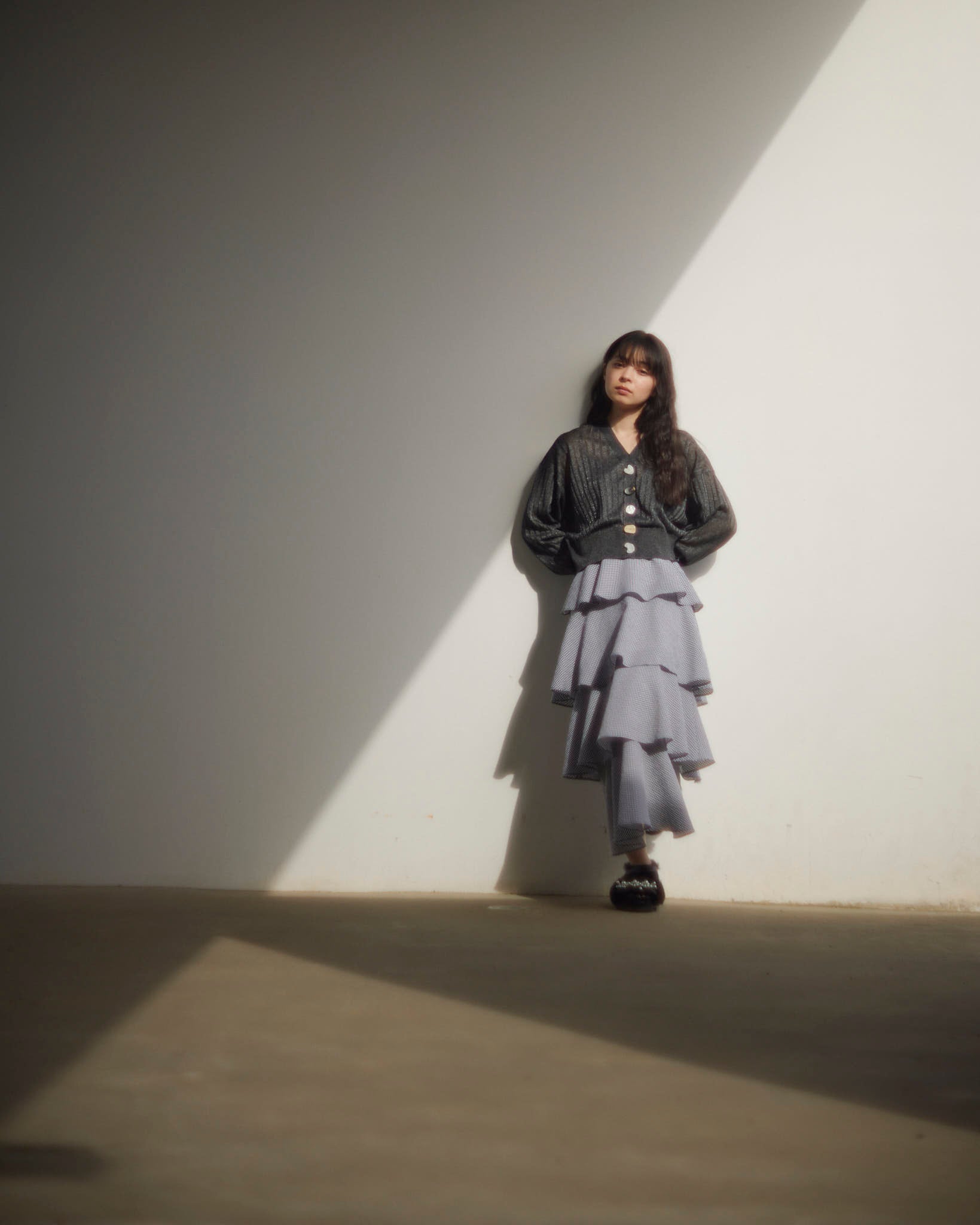 スカートはフレアで表現したティアードが柔らかい印象を与え、華やかさを演出します。