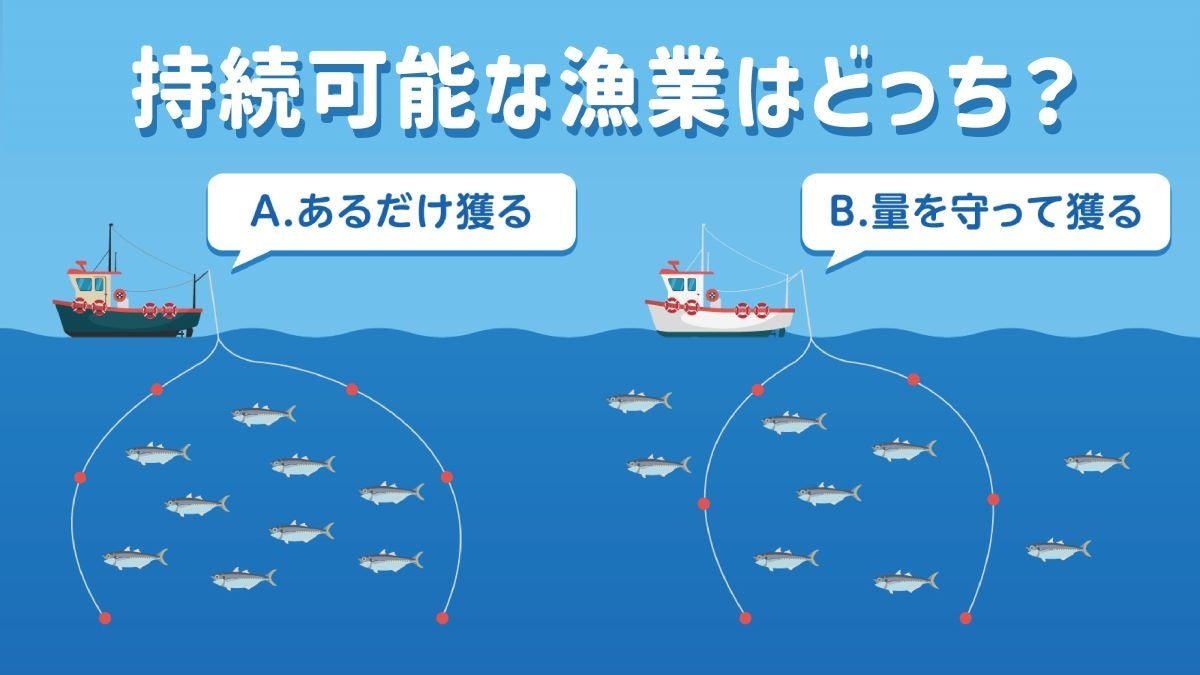 持続可能な漁業とは、将来の世代も安定的においしい魚を食べ続けられるよう、水産資源や海洋環境に配慮して行われる漁業のことです。適切に管理された漁業を行うことで、乱獲や生態への悪影響を防ぐことができます。魚たちの生息地や、絶滅の危機にある種を保護することで海の多様性を守り、豊かな海を未来へとつなぎます。