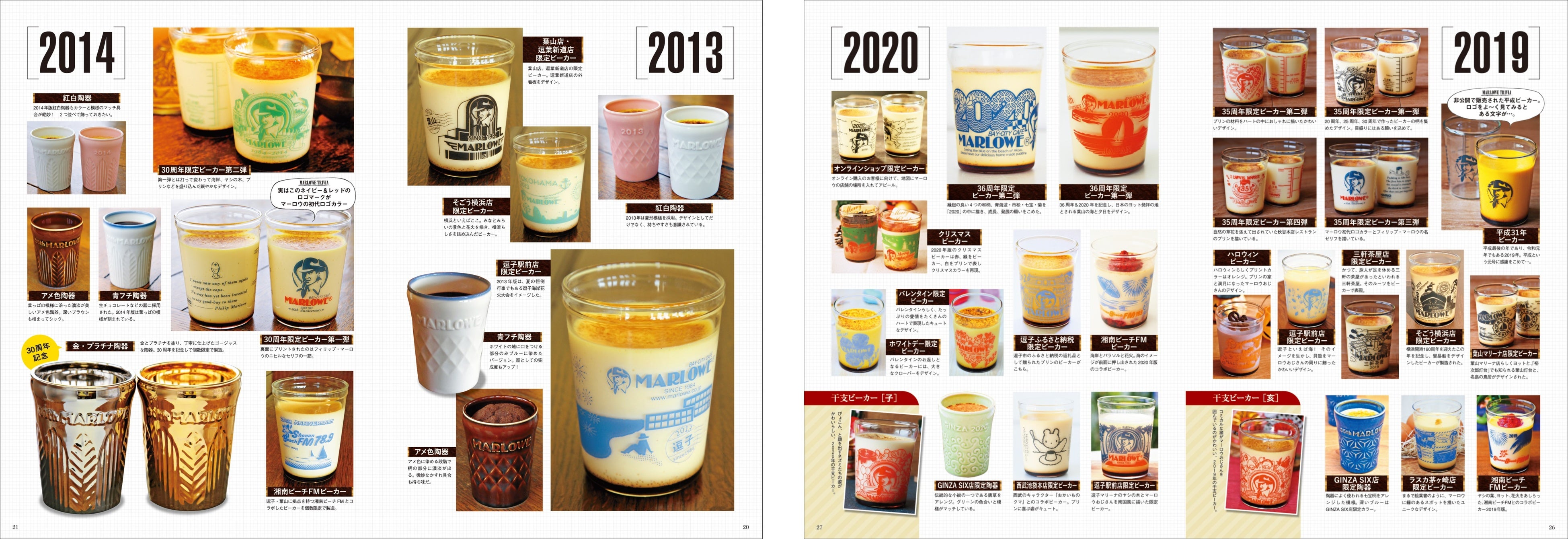 誌面では、プリンとともにお客様を楽しませてきたマーロウの顔「ビーカー」について、2010年から2023年までに登場したラインナップをご紹介しています。ガラスや陶器と様々なデザインがあるので、ショーケースを眺めるだけでも楽しめちゃいます。