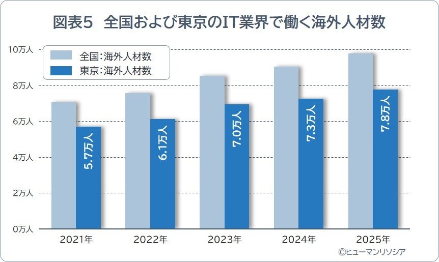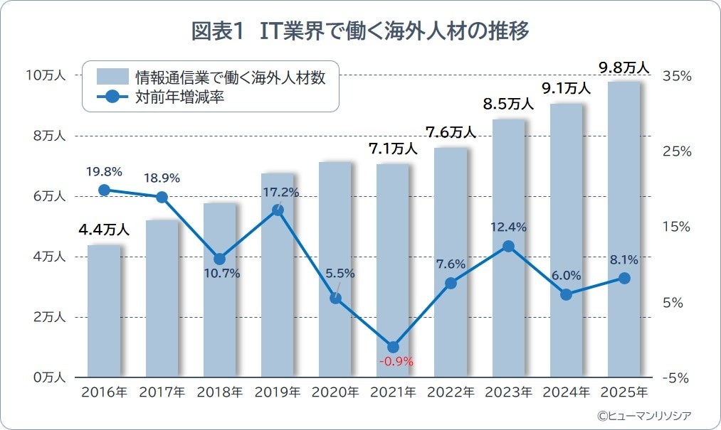 このたび、IT業界で働く海外人材の動向を集計・調査したところ、2025年には前年比8.1%増え、10万人に迫る規模となりました。またIT業界で活躍する海外人材の中心は、ITエンジニアなどの高度・専門職人材であり、約8割が東京に集中していることが明らかとなりました。