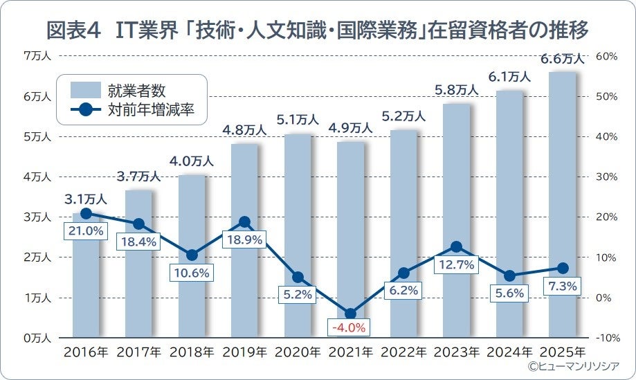 ●IT業界で働く海外人材、10万人に迫る規模に拡大、就業者の3.2%を占める
