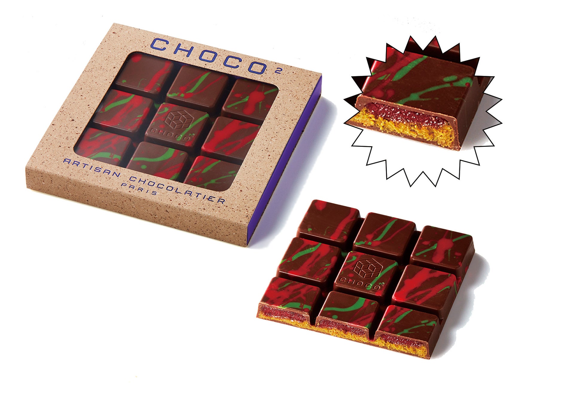 甘酸っぱいフランボワーズコンフィとピスタチオプラリネを41%のミルクチョコレートで包み込んだタブレット。