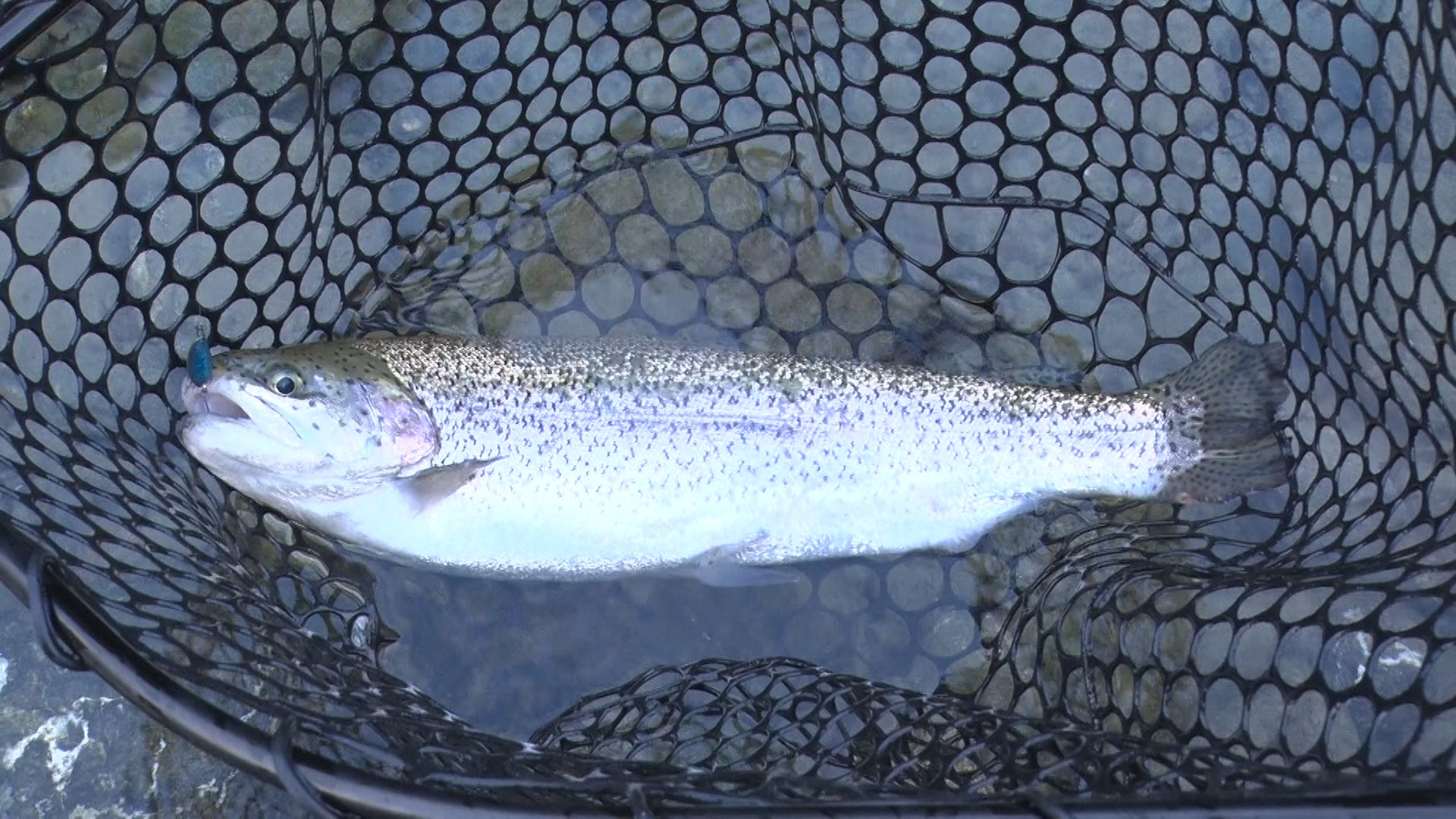 まずはエリアトラウトの定番ルアー「スプーン」でスタート。キャストして着水したらカウントを数える。魚が反応するレンジを探っていく。すると突如、下から突き上げるようにニジマスが食ってきた。