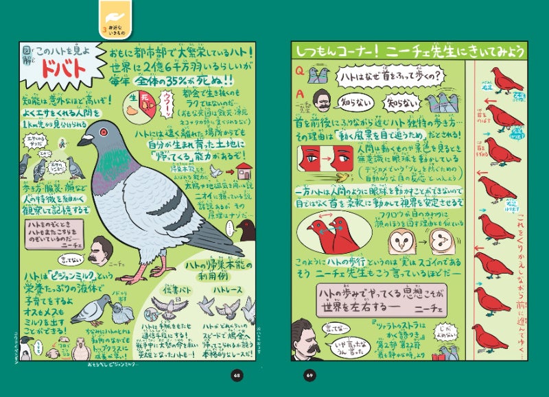 ちょっと残酷ないきものたちの生態も、クスッと笑えるイラストにアレンジ。細部に散りばめられた小ネタやパロディにも注目。