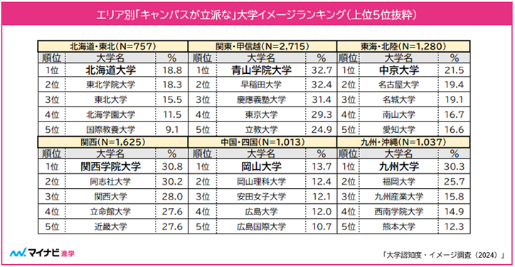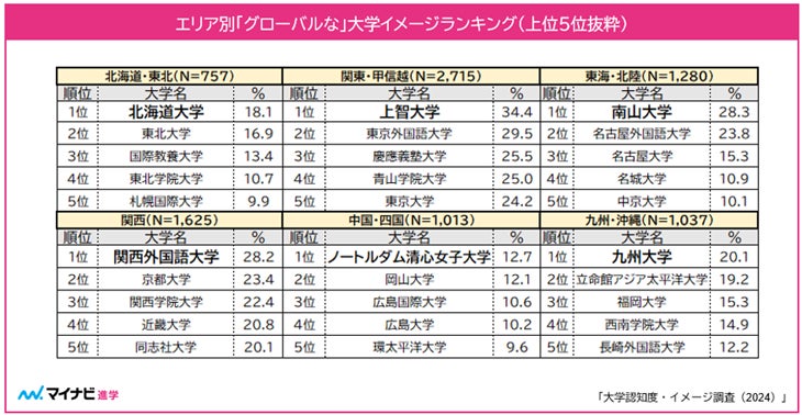 「キャンパスが立派な」大学イメージランキングは、関東・甲信越エリアは青山学院大学、関西学院大学が関西エリアで1位となった。充実した教育環境の整備・充実の取り組みなどが評価につながったと推測される。「グローバルな」大学イメージランキングでは、ノートルダム清心女子大学が中国・四国エリア1位となり、国際文化学部の新設、カリキュラムの導入などが支持を受けたと考えられる。