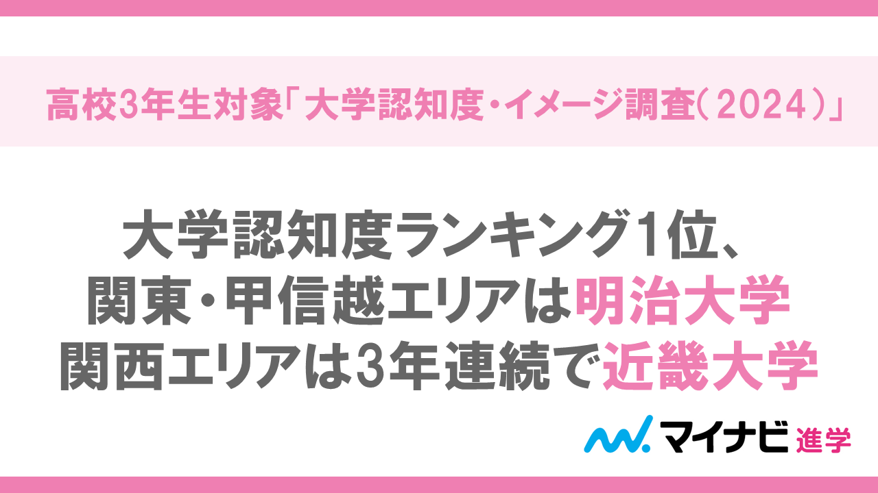 大学認知度ランキング1位、関東・甲信越エリアは明治大学。関西エリアは3年連続で近畿大学。志望大学選びに影響するのは「学べる内容の充実」