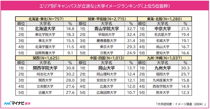 大学認知度ランキング1位、関東・甲信越エリアは明治大学、関西エリアは3年連続で近畿大学。「キャンパスが立派なイメージ」は関東・甲信越エリアは青山学院大学、関西エリアは関西学院大学が1位に【図1、2、3】