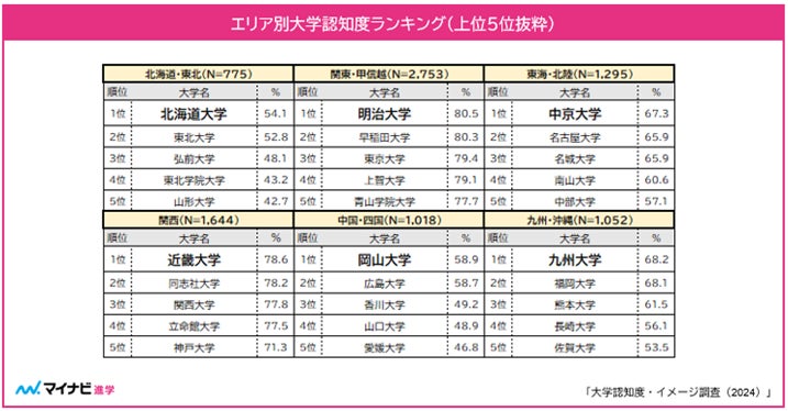 エリア別大学認知度ランキングでは、関東・甲信越エリアは早稲田大学や東京大学を抑え、明治大学が1位となった。関西エリアは近畿大学が3年連続1位に。その他のエリアでは国立大学が上位にランクインし、北海道・東北エリアは北海道大学、中国・四国エリアは岡山大学、九州・沖縄エリアでは九州大学が1位を獲得した。