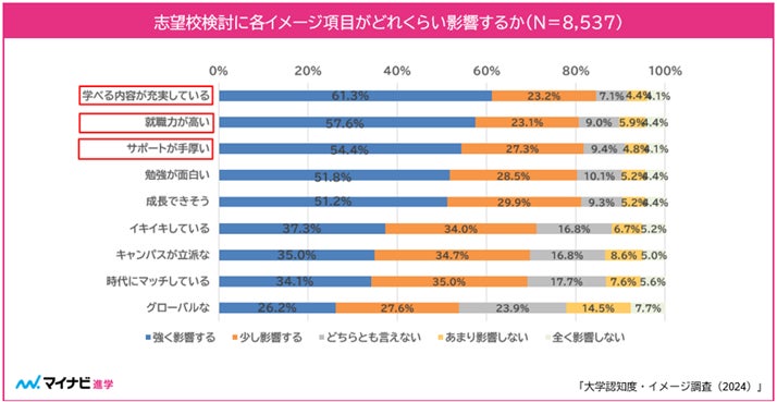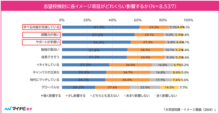 志望校の検討に「強く影響する」イメージ項目について聞いたところ、最も強く影響があるのは「学べる内容が充実している」(61.3%)となった。次いで「就職力が高い」(57.6%)、「サポートが手厚い」(54.4%)と続いた。【図4】