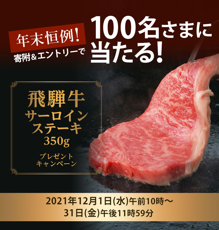 キャンペーン期間中に本サイトより寄附&エントリーされたお客さまを対象に抽選で100名様に、「岐阜県産 飛騨牛サーロインステーキ」をプレゼントいたします。