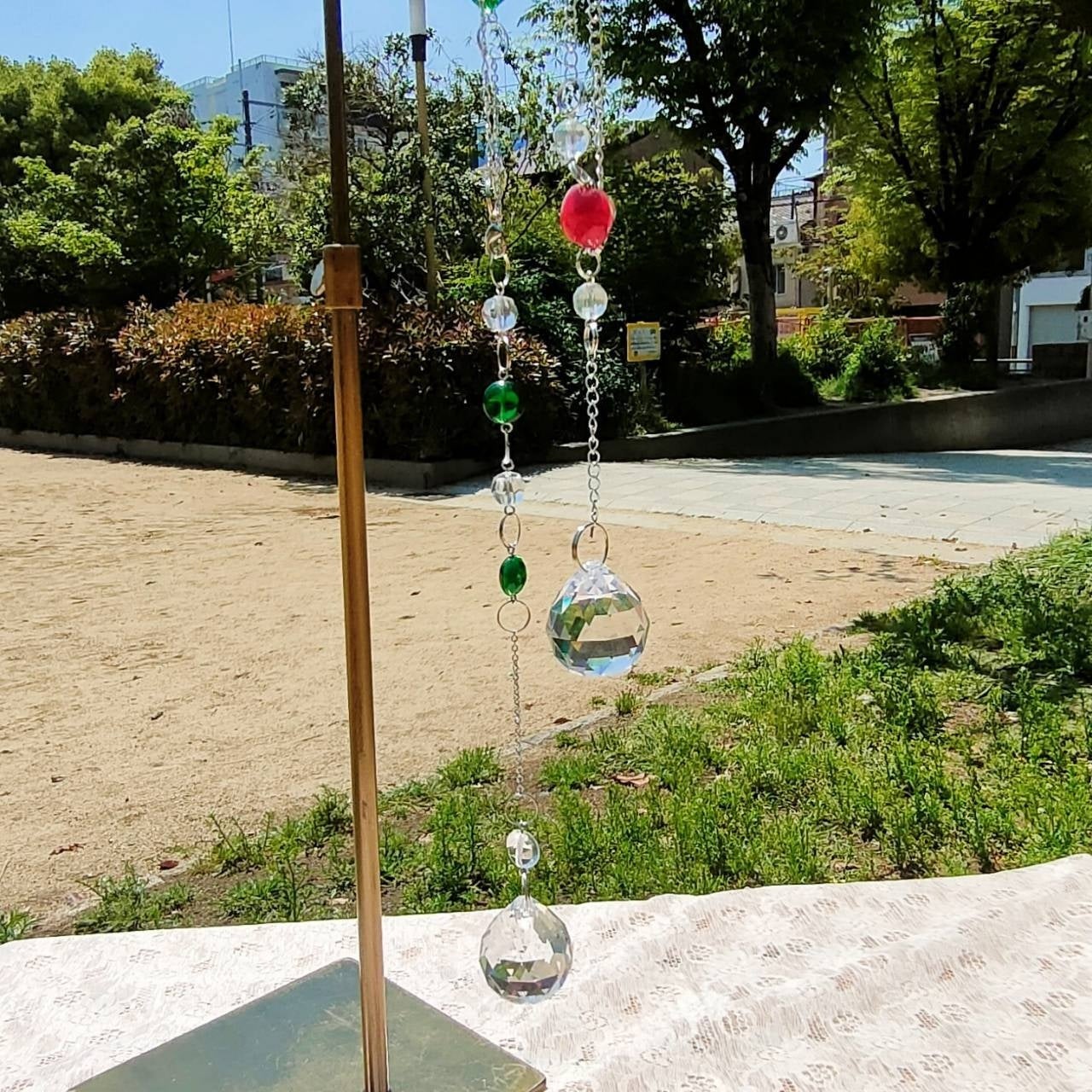 太陽光を浴びて、プリズムのように光り輝くガラスのサンキャッチャーを作ります。お好きなオリジナルガラスビーズを選び、チェーンや二重カンなどのパーツを組み合わせて仕上げます。