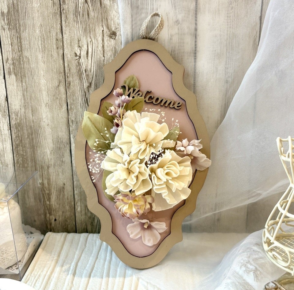 東南アジアで育つ植物「ソラ」の茎を乾燥させ、手作業で加工した天然素材のハンドメイドフラワーです。環境にやさしい花として、注目されるナチュラルカラーの「ソラ」を使用したフリルフラワーを3輪作り、絵の具でお好みの色を塗ったウエルカムボードにアレンジしてみましょう。