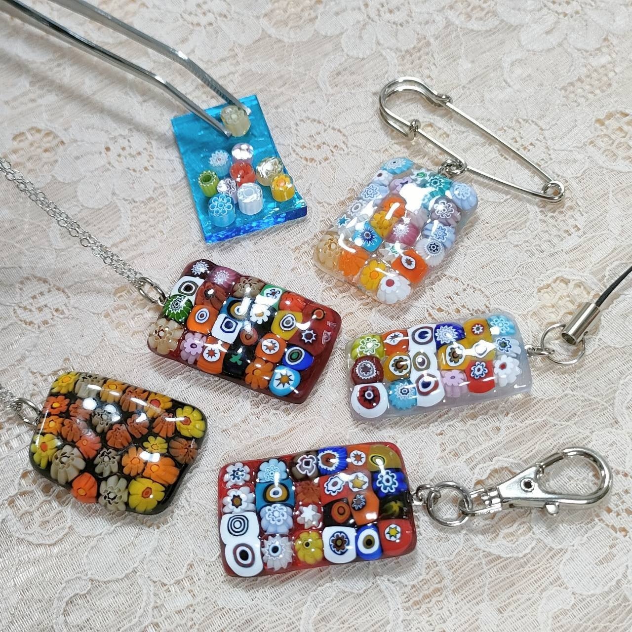 イタリア語で千の花を意味する“ミルフィオリガラス”。まるで金太郎飴のように断面に美しい模様が現れるのが特長です。ガラス板にピンセットで一粒ずつ並べて、オリジナルガラスアクセサリーを2種類作ります。お預かりしたガラスを溶かした後、金具をお付けし完成した作品を後日郵送いたします。