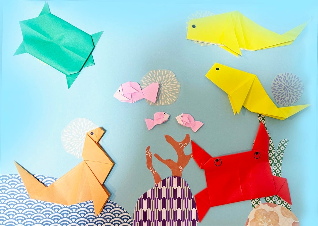折り紙の鮮やかな色彩を活かして、海の世界を表現する「オリジナル水族館」を作っていただけます。魚やオットセイ、カニなどの水に棲む生きものたちを折り、完成した作品を画用紙に飾り付けて、世界に一つだけの水族館を完成させます。