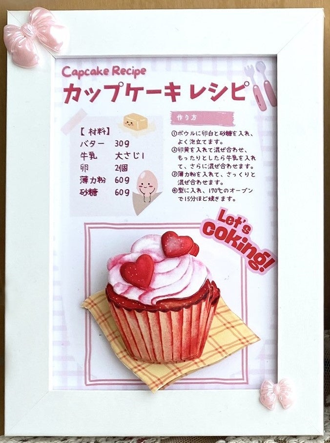スイーツレシピ入りの可愛い3Dフレームを作っていただけます。パンケーキまたはカップケーキ、どちらかをお選びいただき、イラストを切り重ね、少しずつ立体感を出して仕上げます。完成したフレームは、可愛らしくお部屋のインテリアとして飾っていただけます。