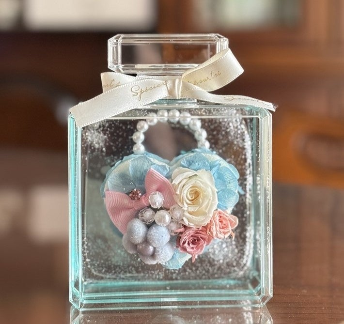 花々で可愛らしくアレンジしたハート型のバッグを、ジェルを使用し、香水瓶の中に浮かんでいるかのような作品に仕上げていただけます。愛らしいピンクに、夏らしくブルーを組み合わせ、見た目にも涼やかです。お子様はもちろん、大人の方お一人でのご参加もおすすめです。