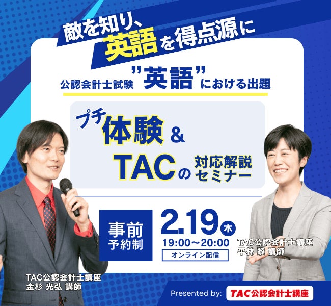 《開催間近!》【TAC公認会計士講座】英語試験対策「講義体験&セミナー」を2/19(木)にオンラインにて実施